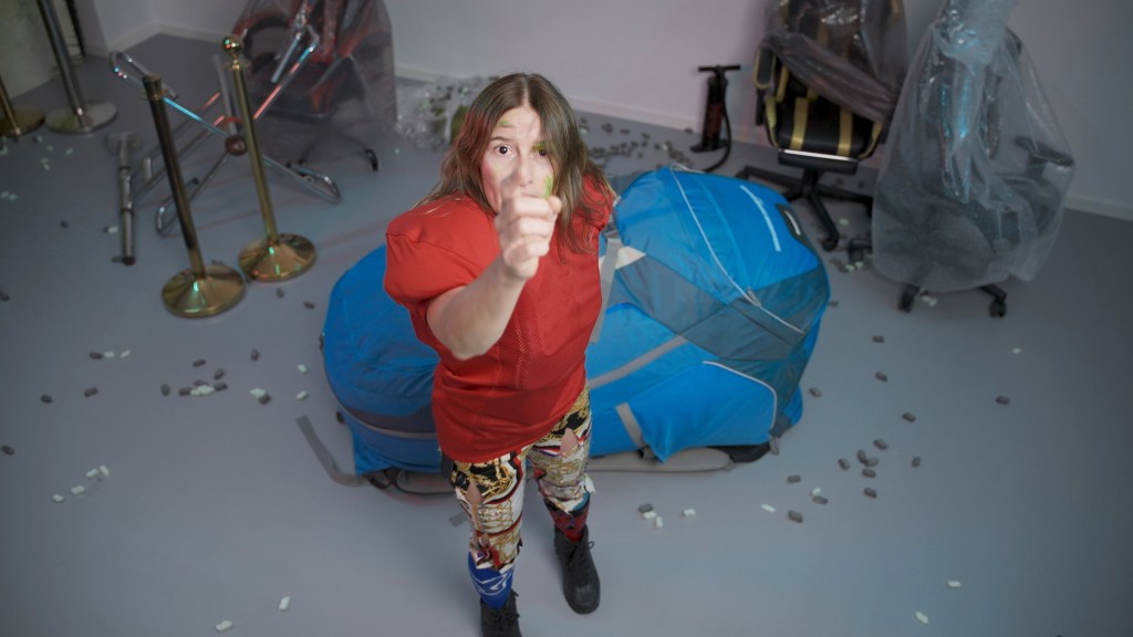 »Deliver, deliver, deliver, deliver, I’m your deliver delivery, I’m your delivery deliver, I’m your delivery deliver delivery, I deliver tokenism, I deliver you a boss, I deliver your perfect coach & artsy art consulter, I deliver mini jobs and alcopops, I deliver all your medicine right before you know you’re ill … I deliver everything!« raps the Delivery Heroine (Lisa Marie Janke) in a battered quarterback dress and feral make-up to the driving beat – alone in a storage room in front of a huge backpack and gaming chairs wrapped in bubble wrap. The ubiquitous delivery services from Amazon to Gorillas to Zalando are only partly the point here. Rather, Anima Overdrive ‘delivers’ the sound of rebellious exhaustion in a world increasingly defined by algorithms and A.I. in the service of turbo-accelerated platform capitalism. A world in which quite everything threatens to become a commodity, and we all breathless suppliers.